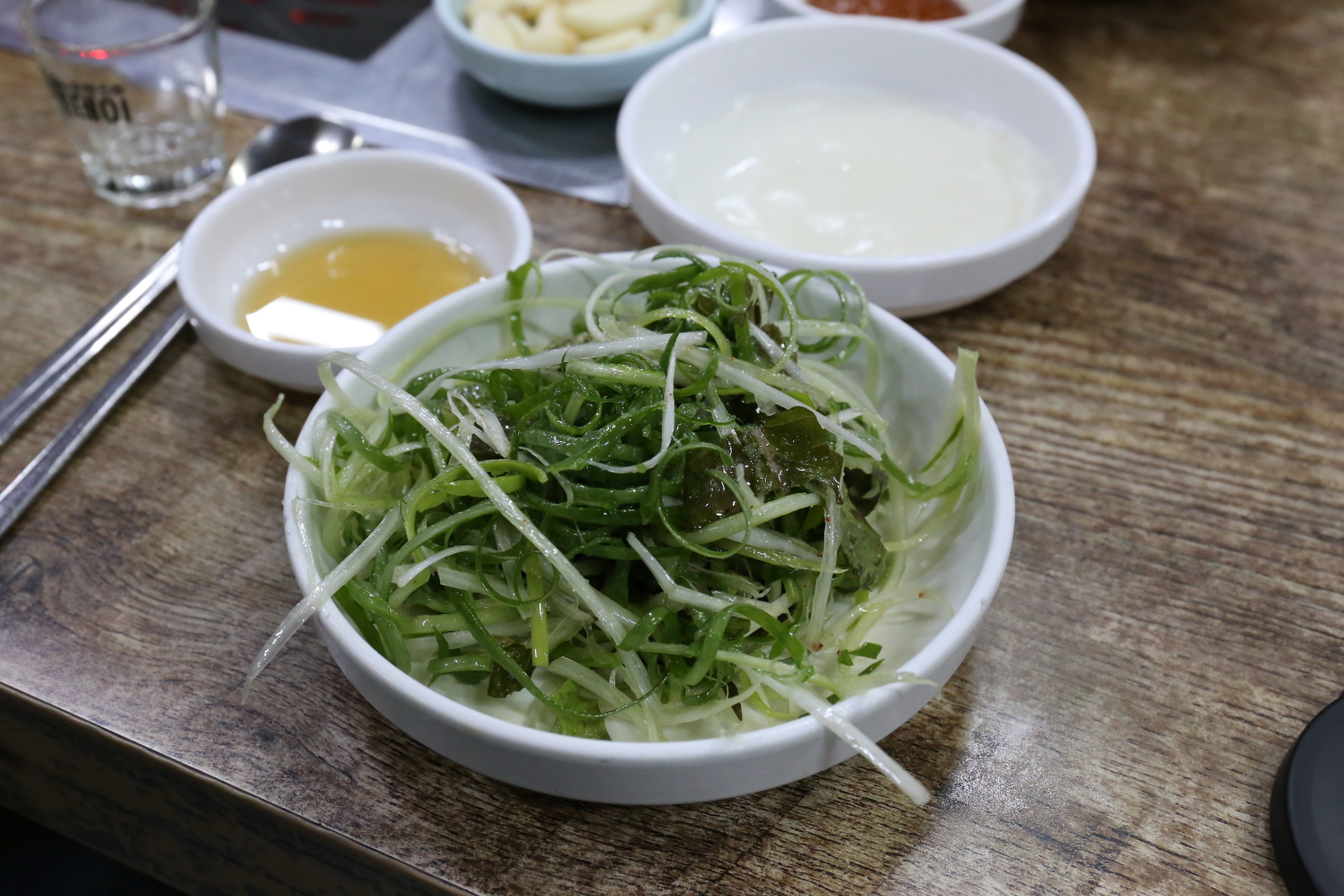 차돌박이 한 점이랑 파무침, 양파를 곁들여서 한 쌈.