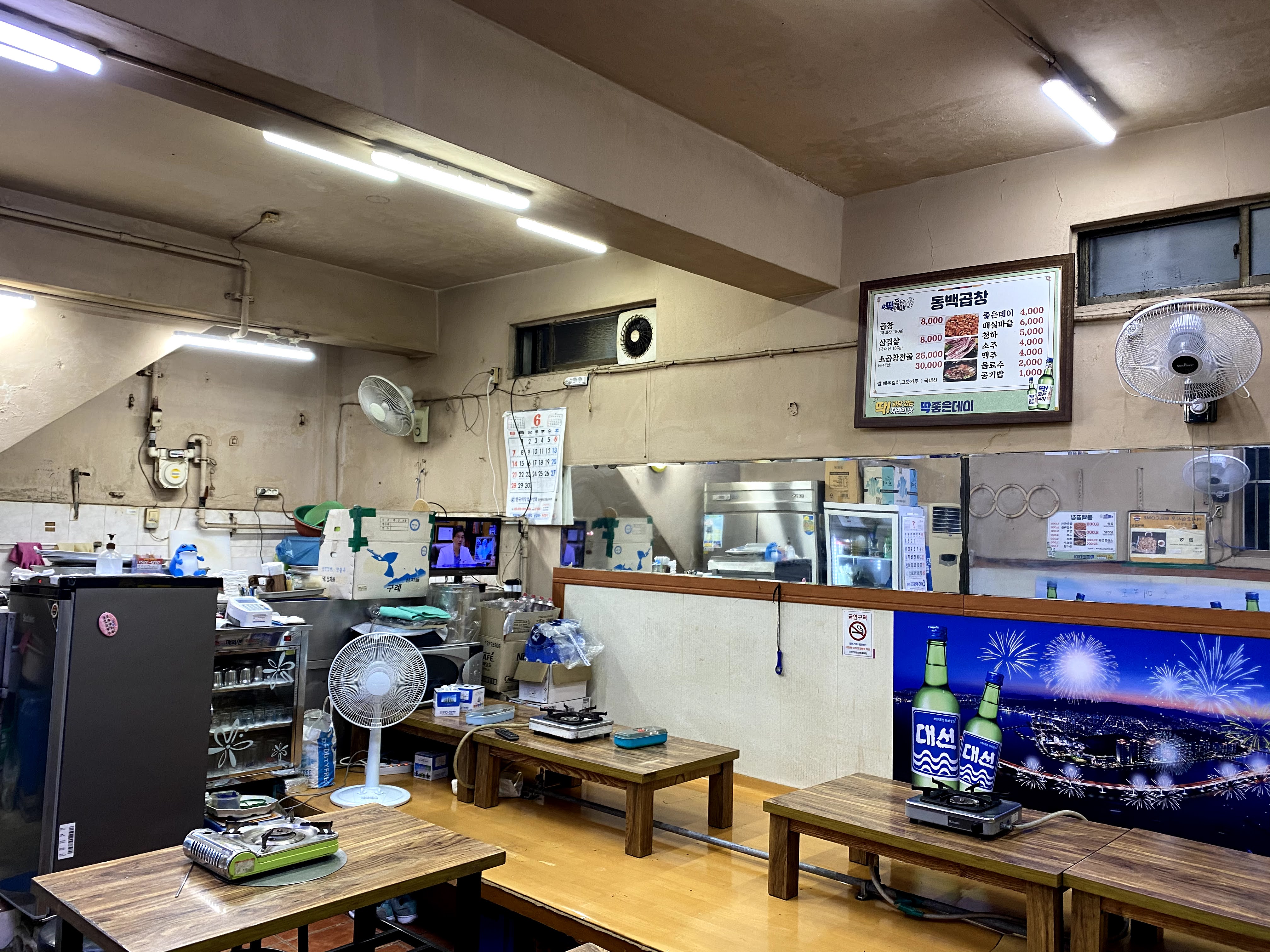 이번에 방문한 곳은 지인이 단골이라고 추천한 동백곱창. 50년전통이라는 간판의 글씨마저 희미한데 늦은 시간에 방문했더니 할머니 혼자 운영하고 있었다.