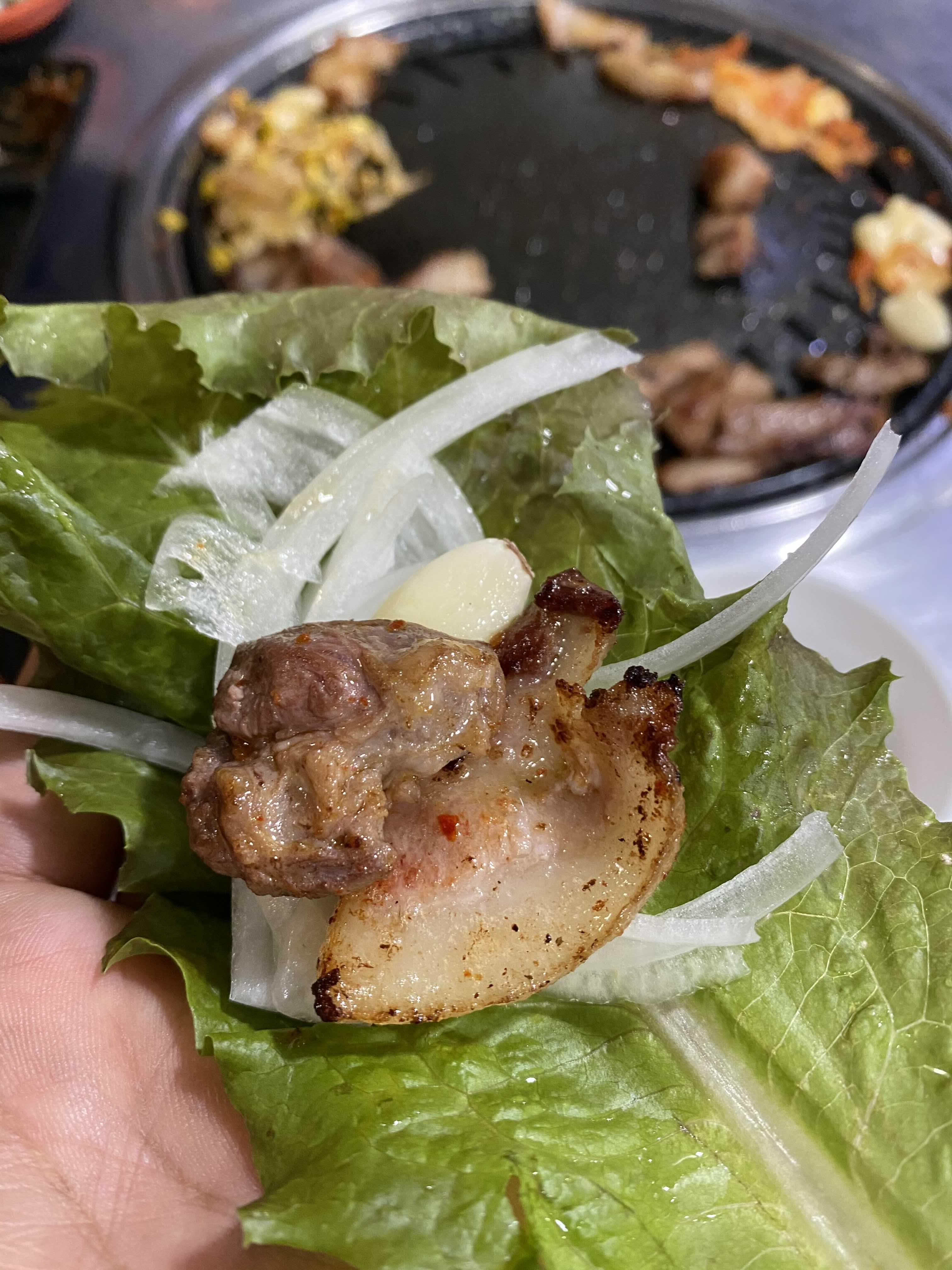 상추 위에 이것 저것 올려서 한 입 먹어본다.