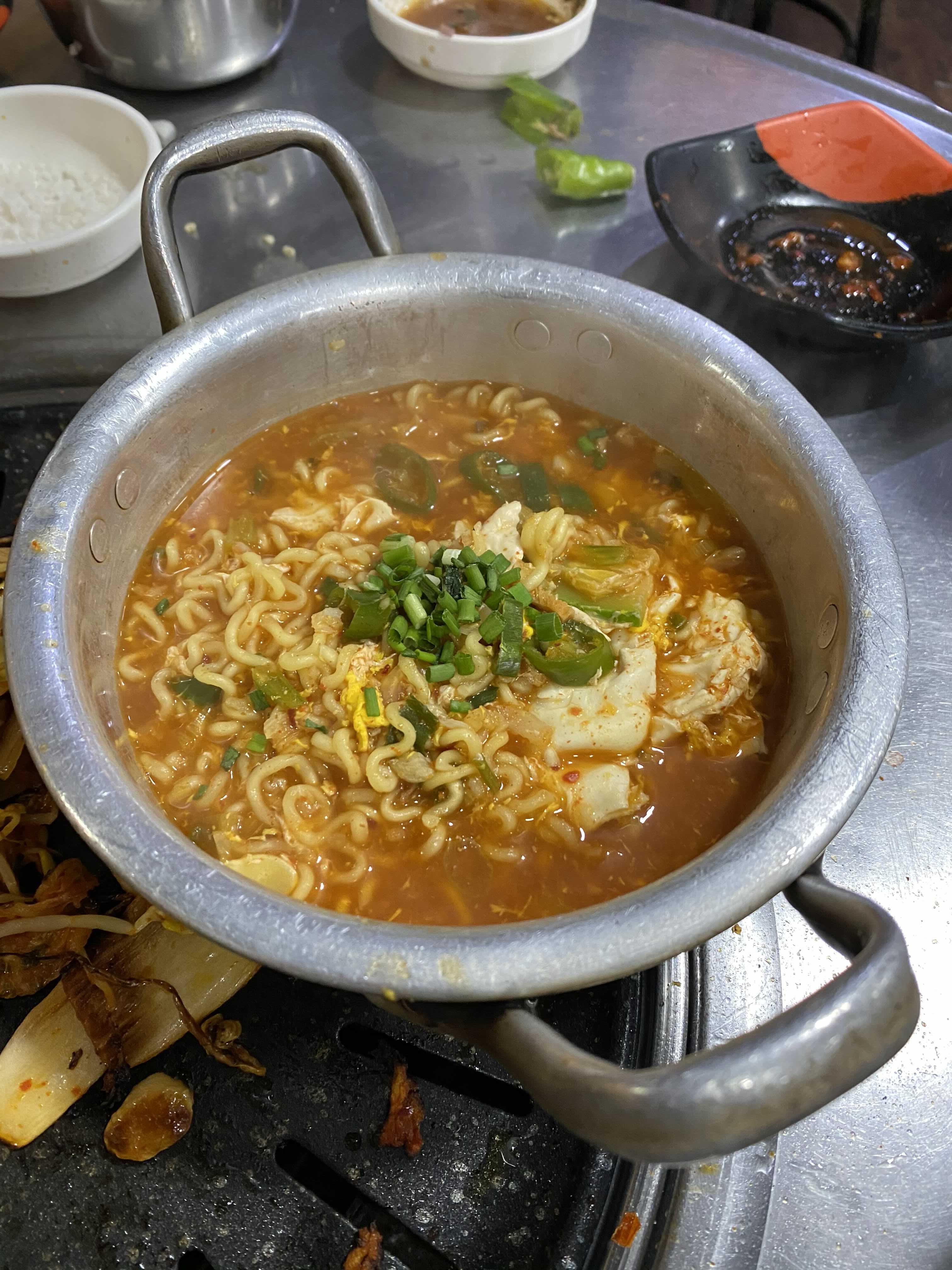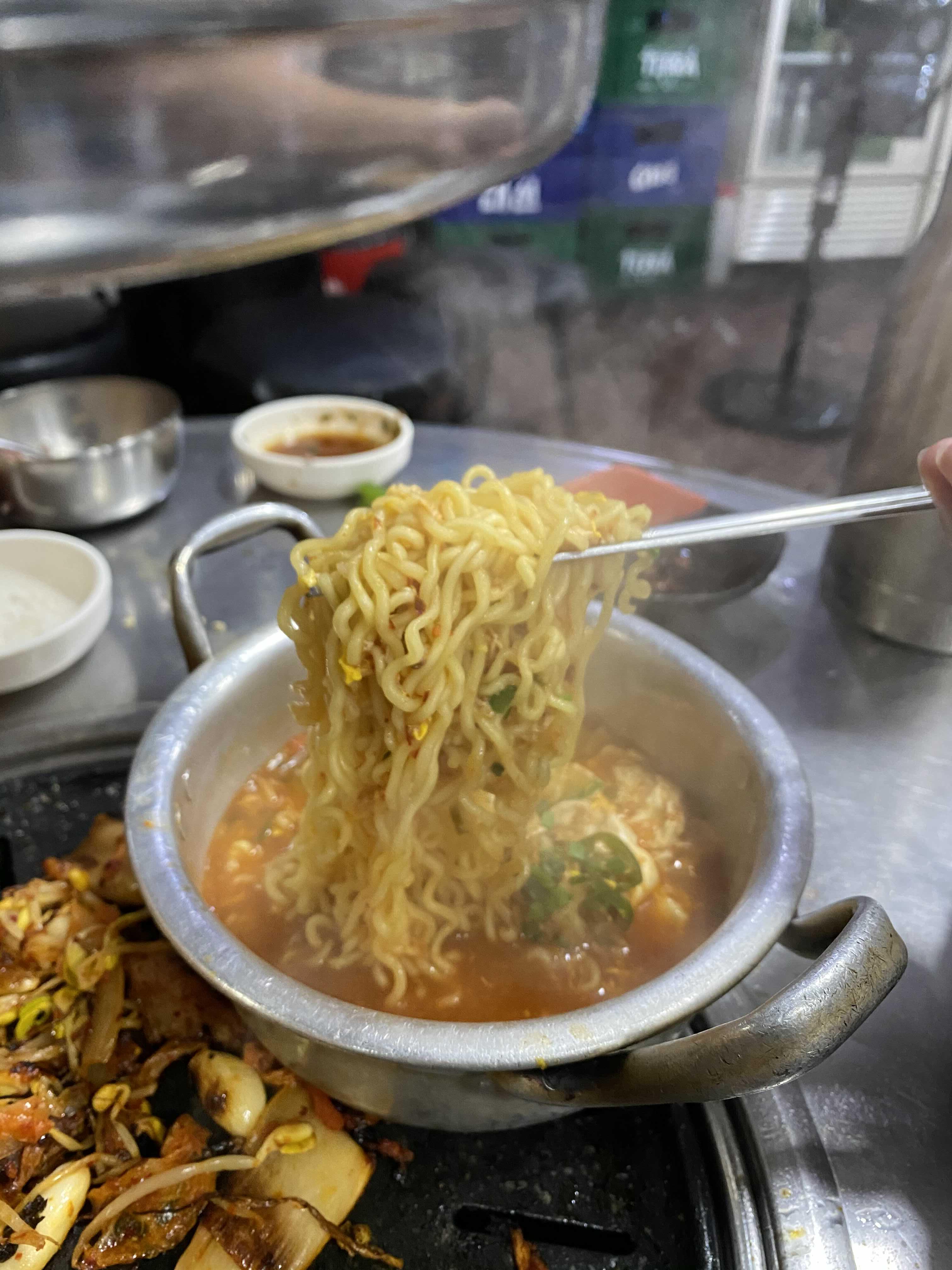 그냥 여기서 끝내자고 말했더니 친구가 라면을 하나 주문했다.