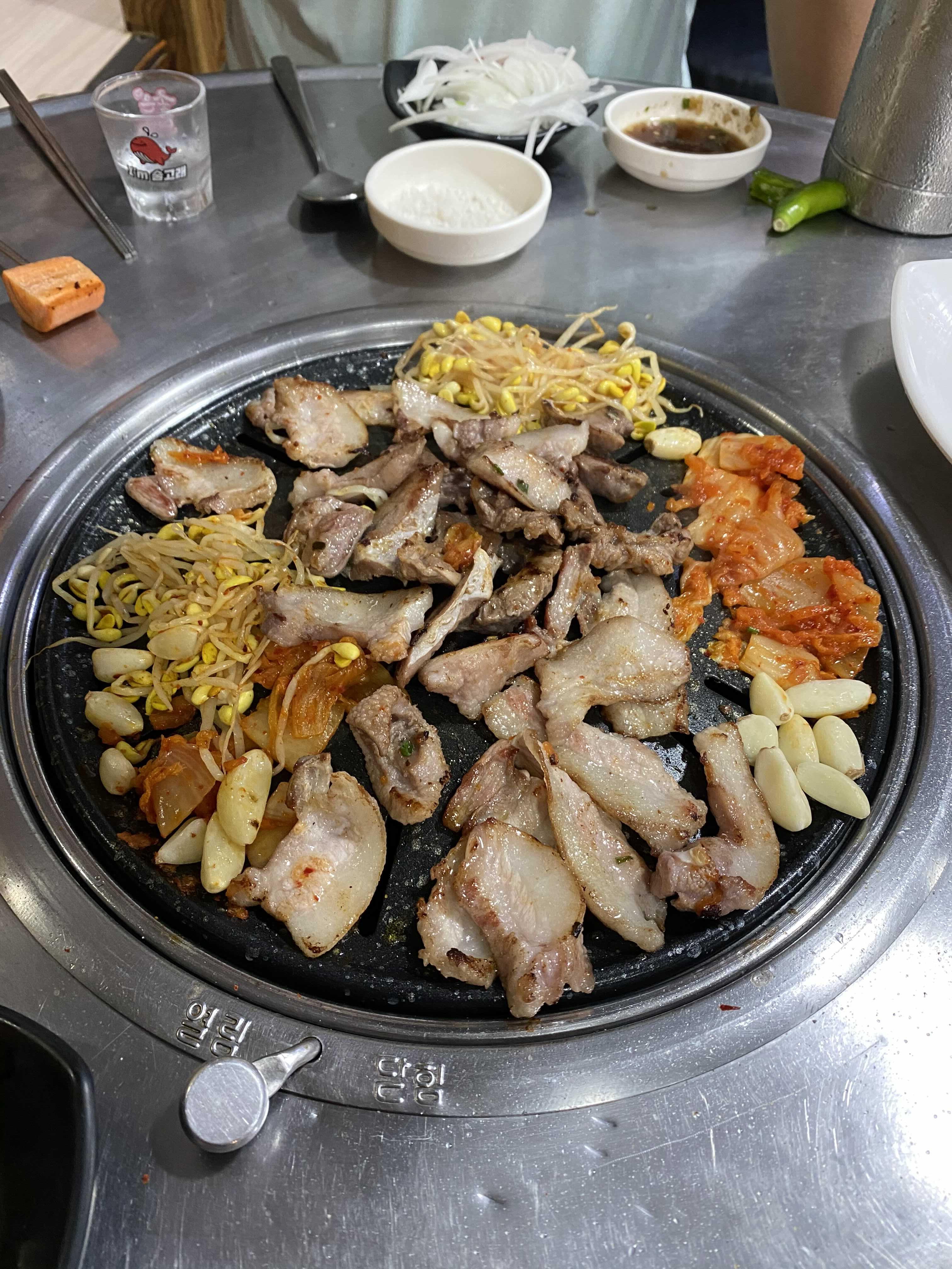 친구가 호기롭게 뒷고기 한 판을 그대로 올려버렸다.