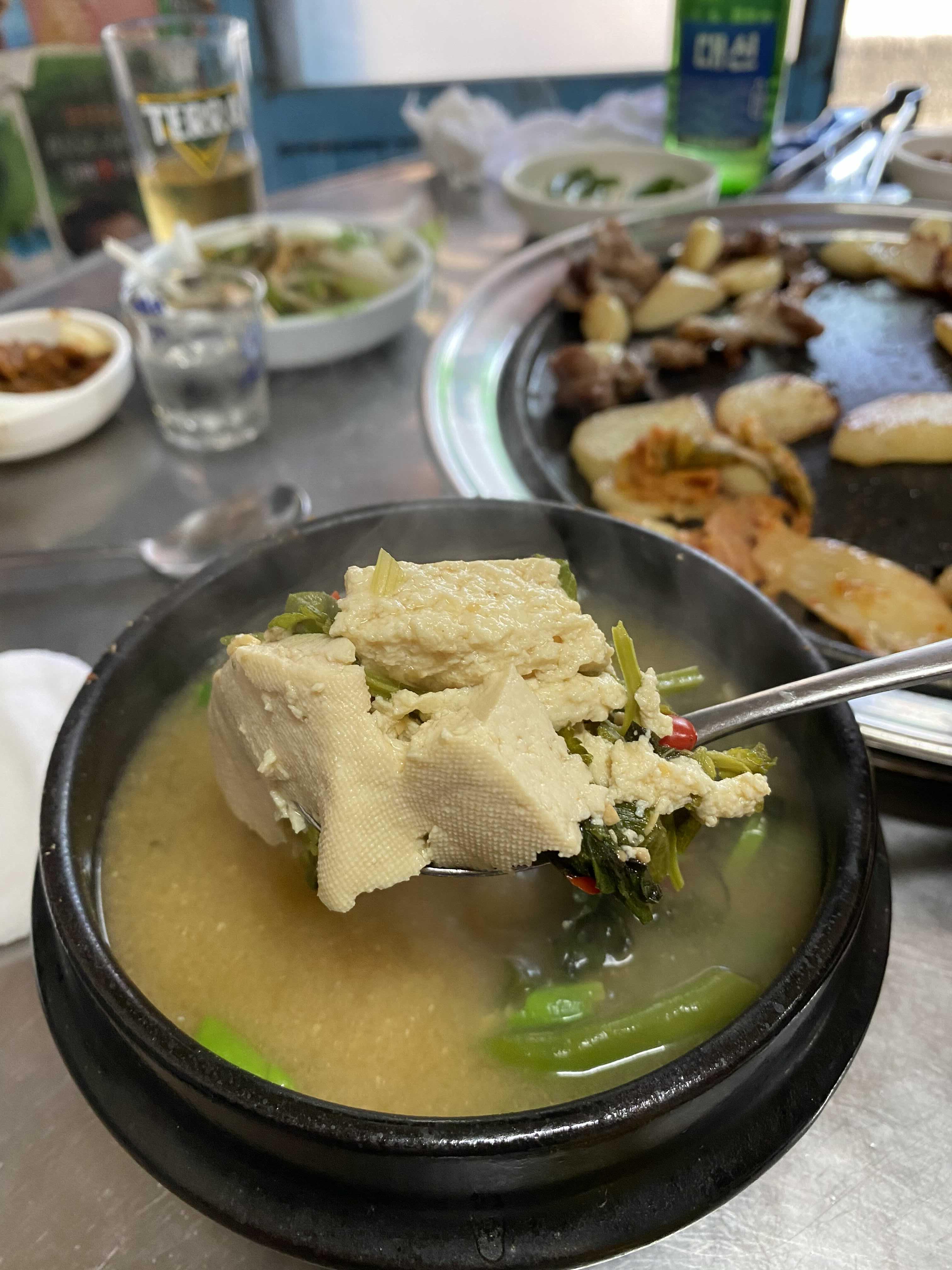 두부가 투박하게 들어있다. 좀 묽긴 했지만, 시골에서 할머니가 끓여주는 그런 그런 된장찌개 맛이다.