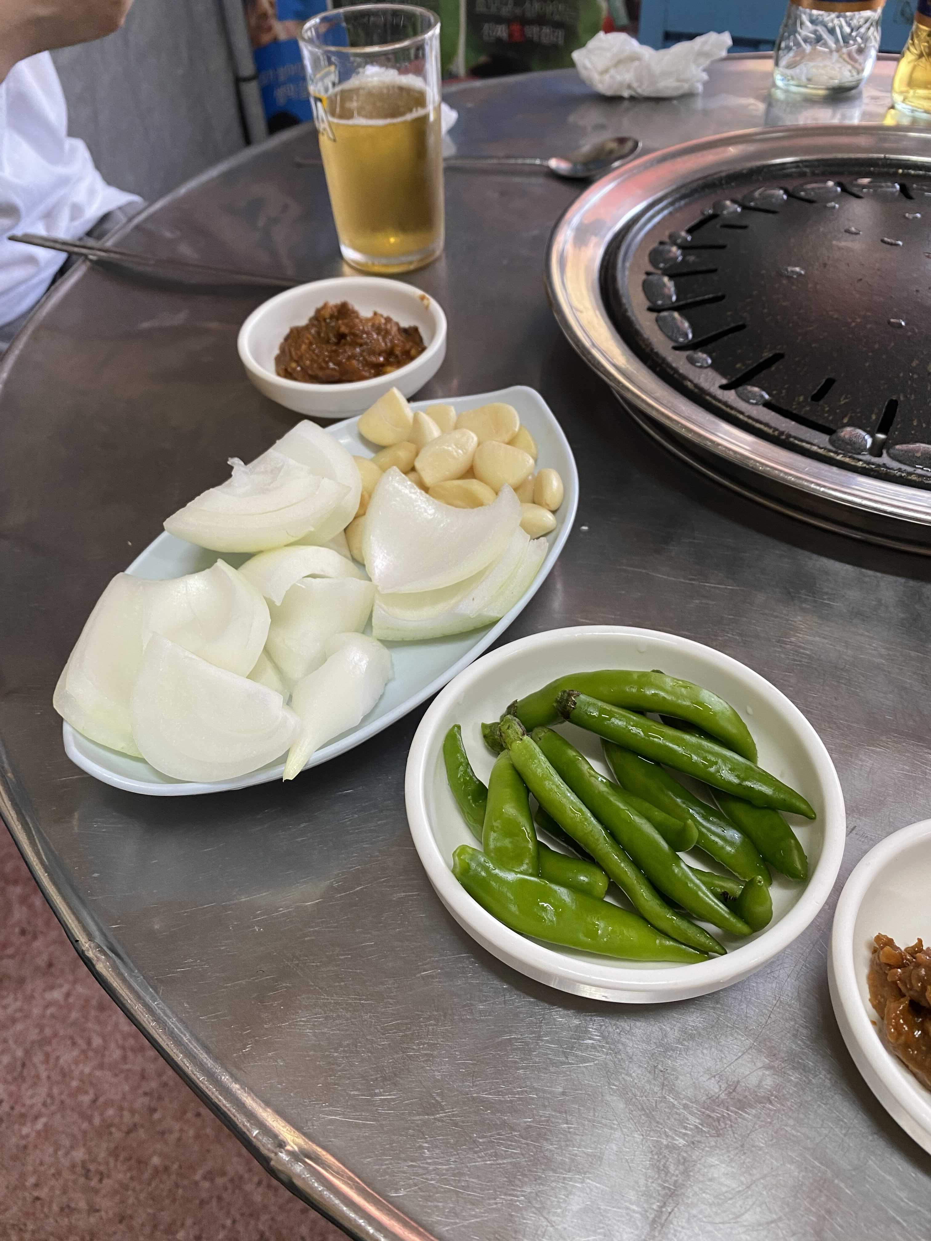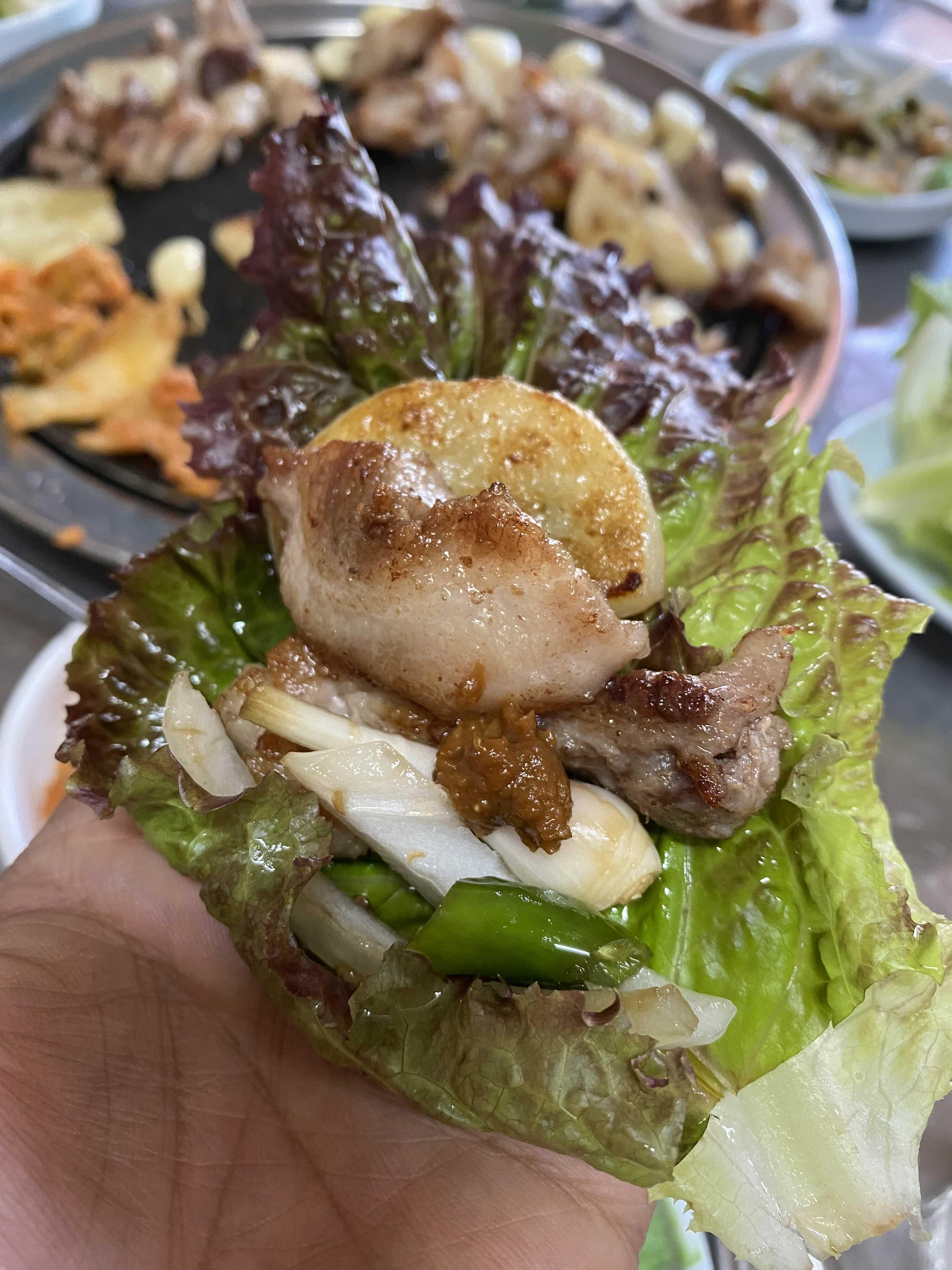 구운김치, 양파, 된장에 박힌 마늘까지. 이렇게 싸 먹으면 고기도 술도 쭉쭉 들어간다.