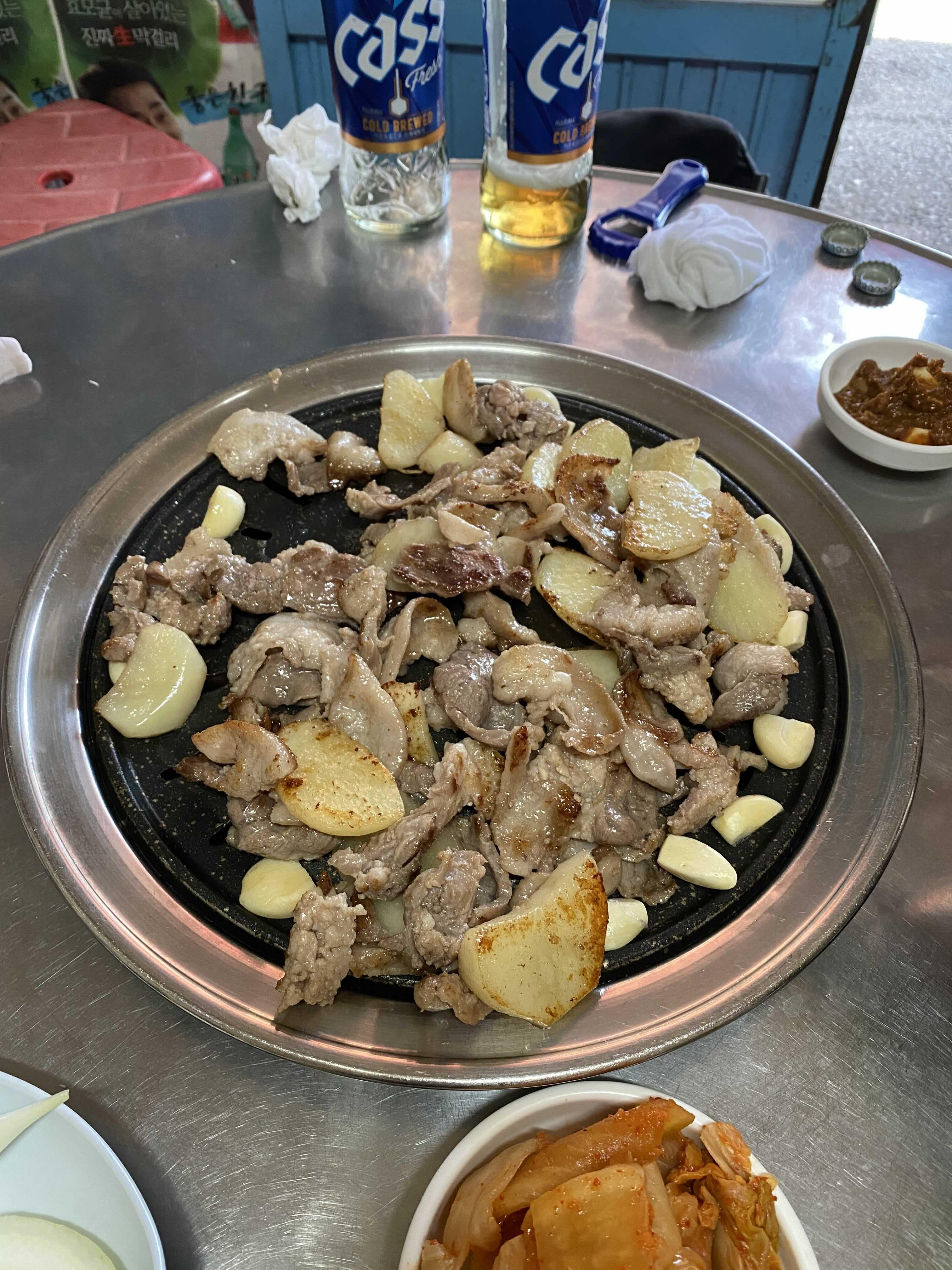 뒷고기 한 판. 프라이팬에 초벌해서 우리 불판에 올려준다.