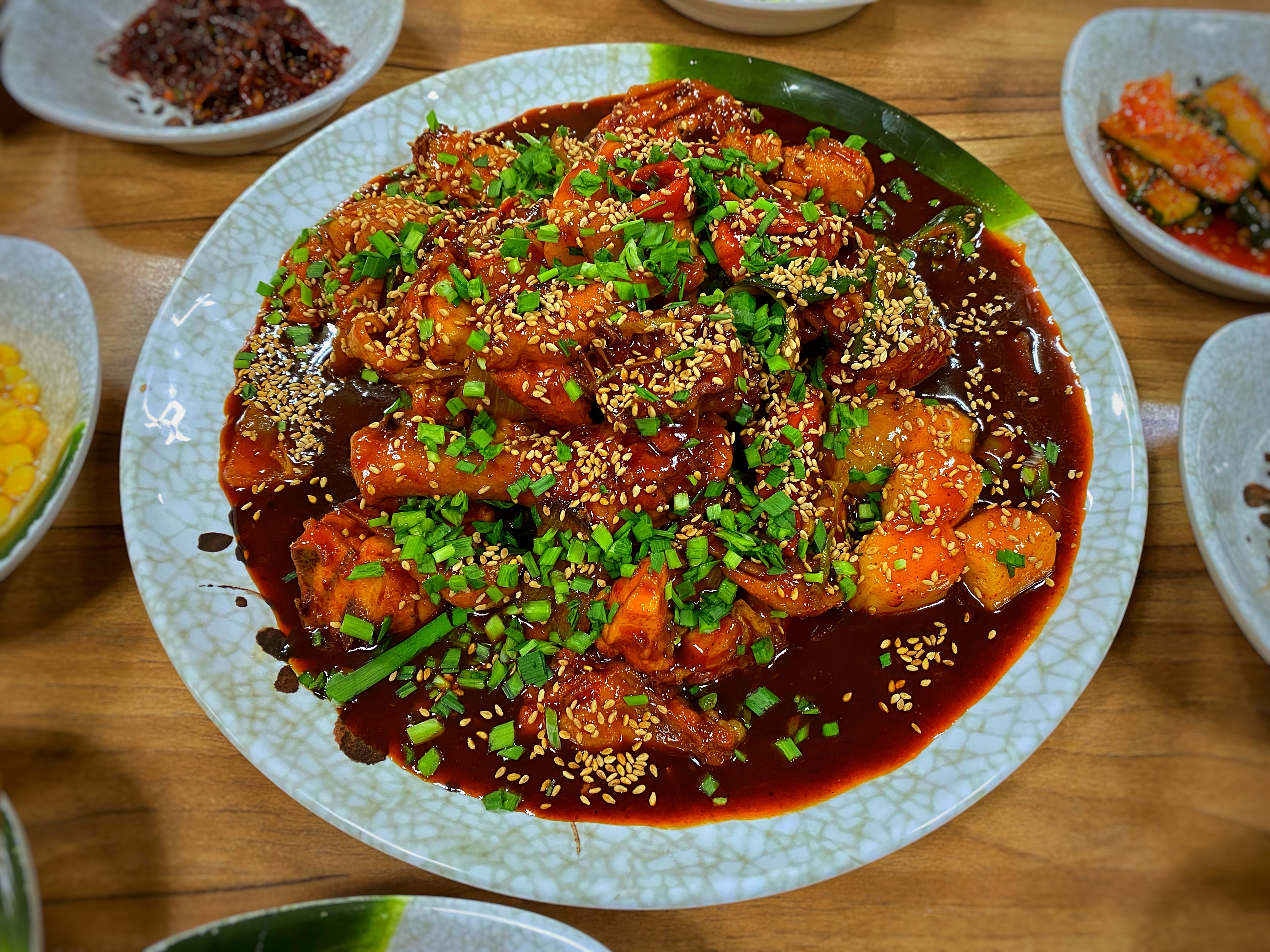 이 집의 간판은 찜닭인데 메뉴는 닭찜이다. 찜닭이라고 하면, 간장을 베이스로 단짠한 양념의 안동식 찜닭이 떠오른다. 찜닭이라는 글자의 앞뒤를 바꾼 닭찜이라는 메뉴는 찜닭과 달리 붉은 양념이 많다. 고추장을 베이스로 한 매콤하면서 단짠한 맛이다.