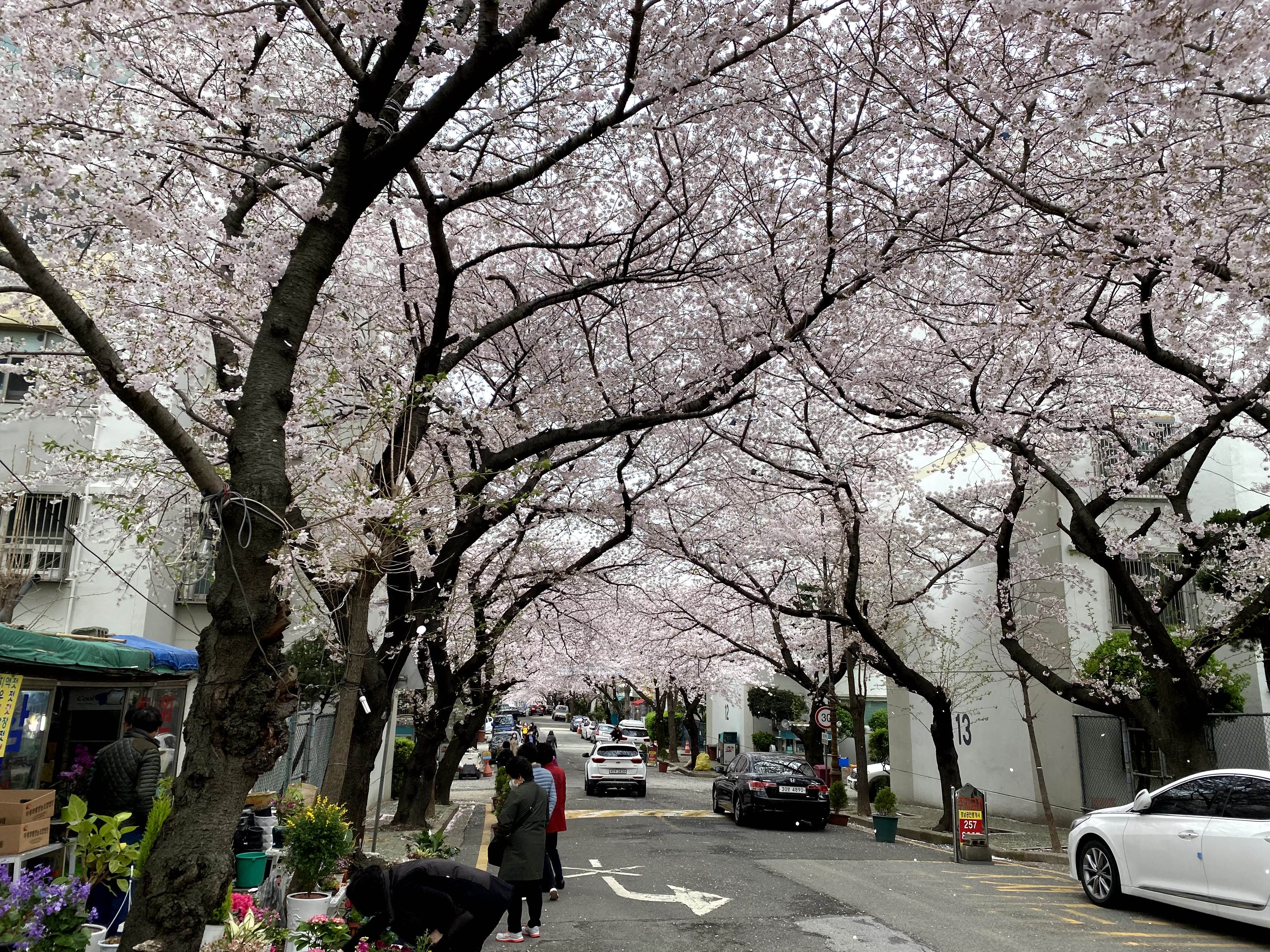 햇볕이 쨍쨍한 맑은 날이면, 파란 하늘과 대조되는 벚꽃이 더 예쁠 것 같다.