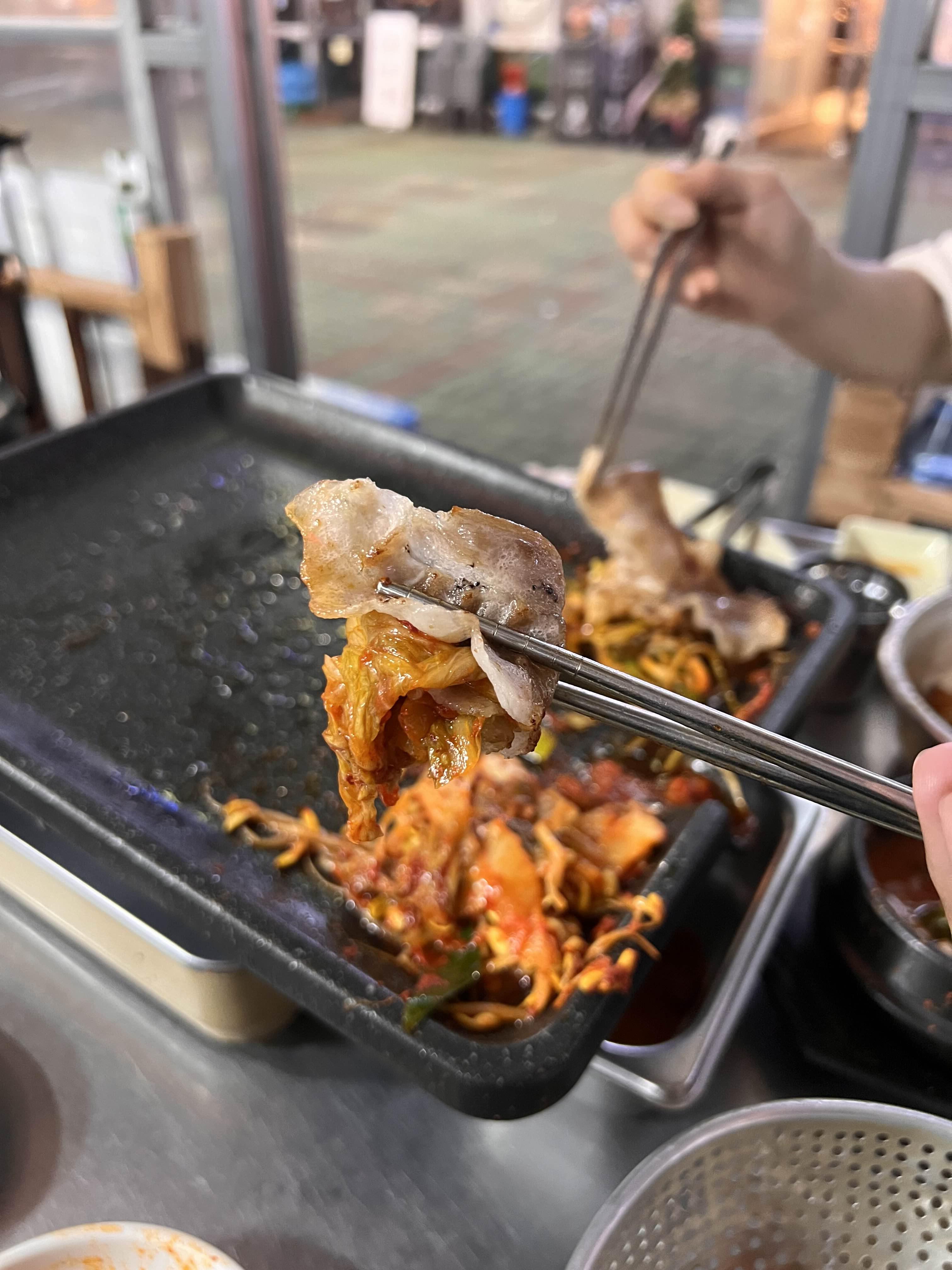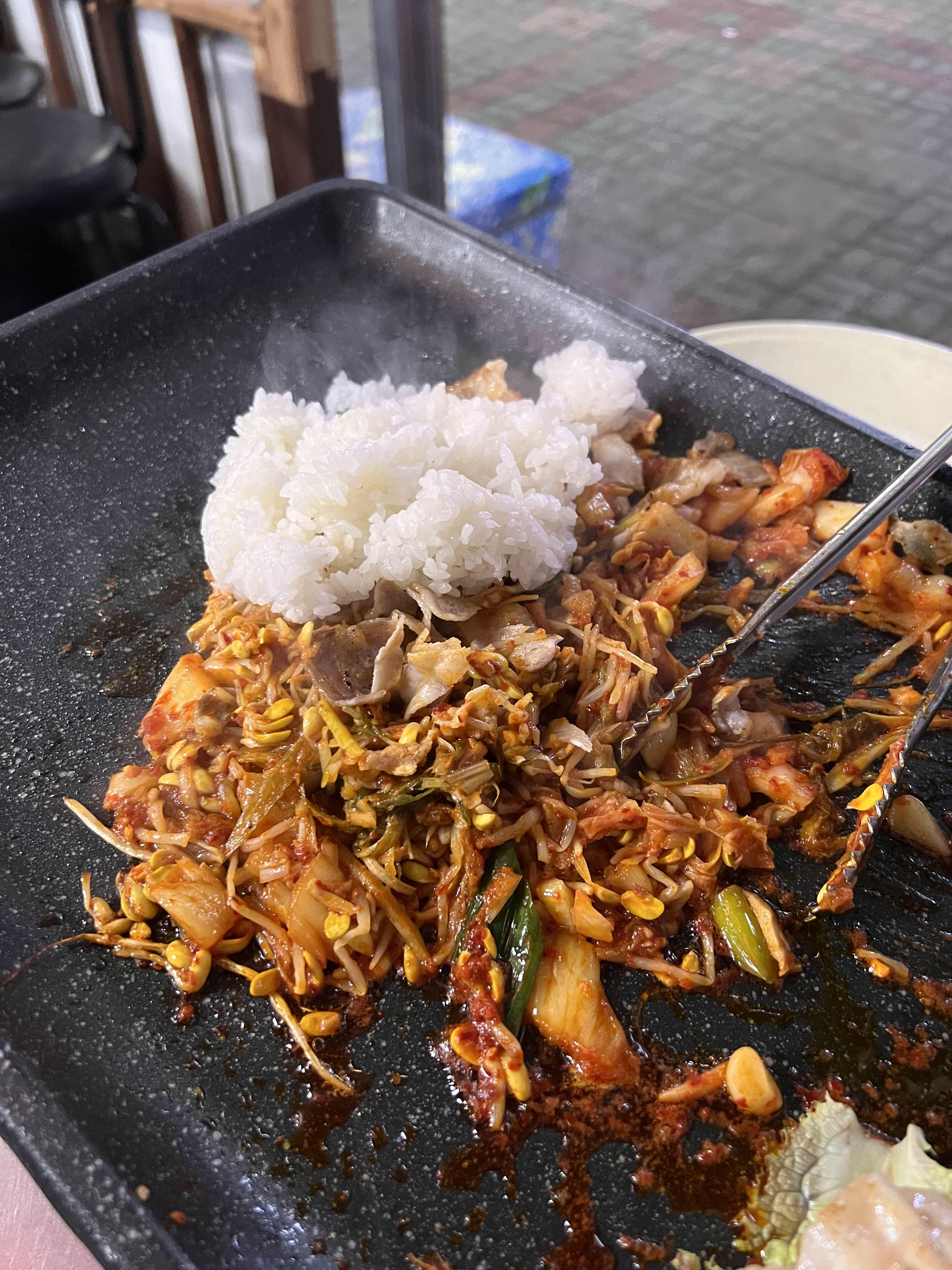 고기를 조금 남기고 콩나물, 신김치, 파절임을 잘게 자르며 구워준다. 그리고 공깃밥 하나 투하.