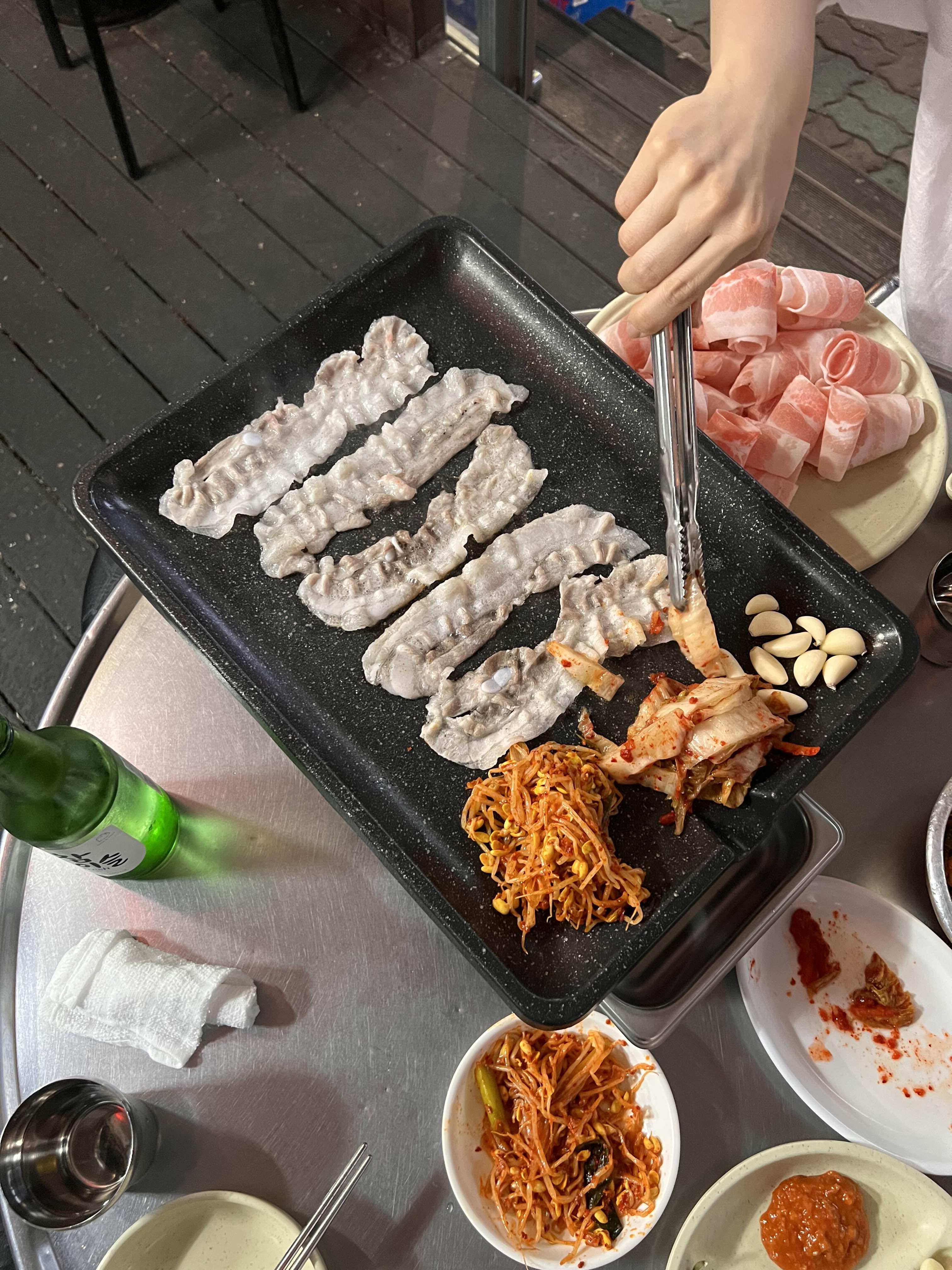 고기와 함께 김치, 콩나물, 파절이, 생마늘을 불판에 함께 올려 구워 먹어야지.