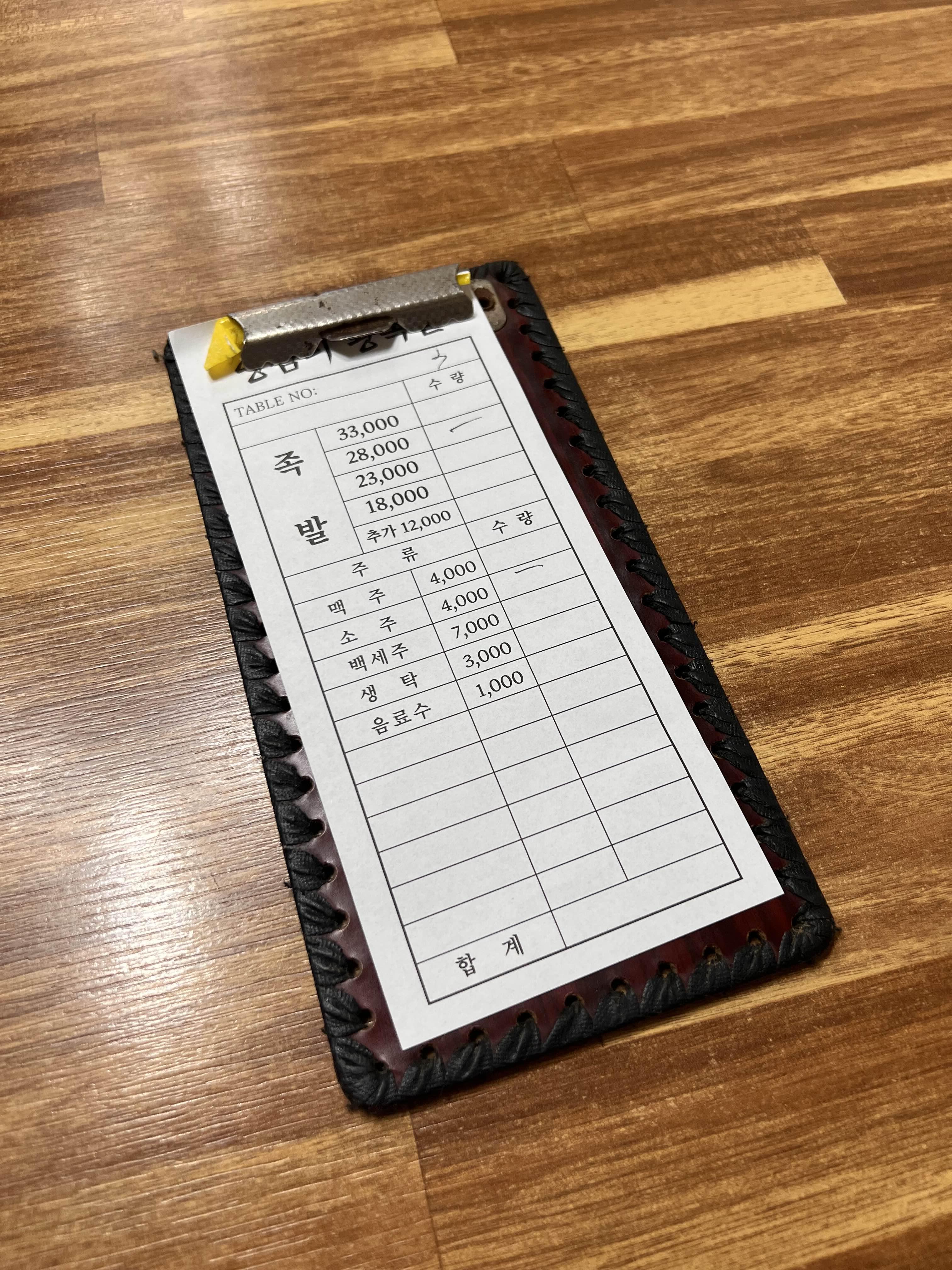 가게 입구에서 족발을 썰고 있다. 5시쯤 방문해서 손님이 많지는 않았지만, 포장손님은 꾸준하고, 이 날도 6시가 넘어가는 시점부터 만석이었다. 그리고는 웨이팅 시작.