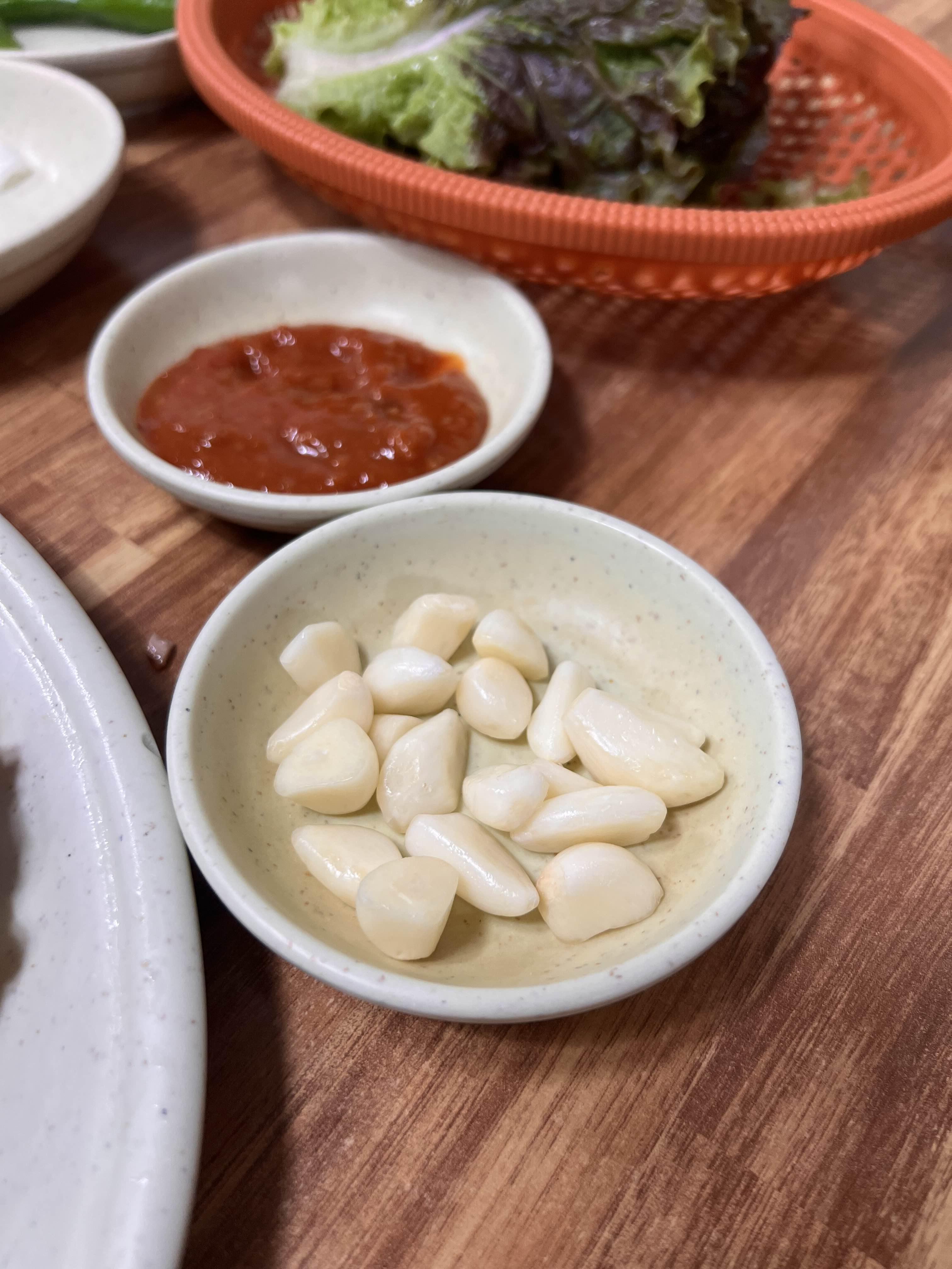 콩나물국이 1인당 한 그릇씩, 절임무, 마늘, 양파, 고추, 상추 그리고 족발. 이내 한 상이 차려진다.