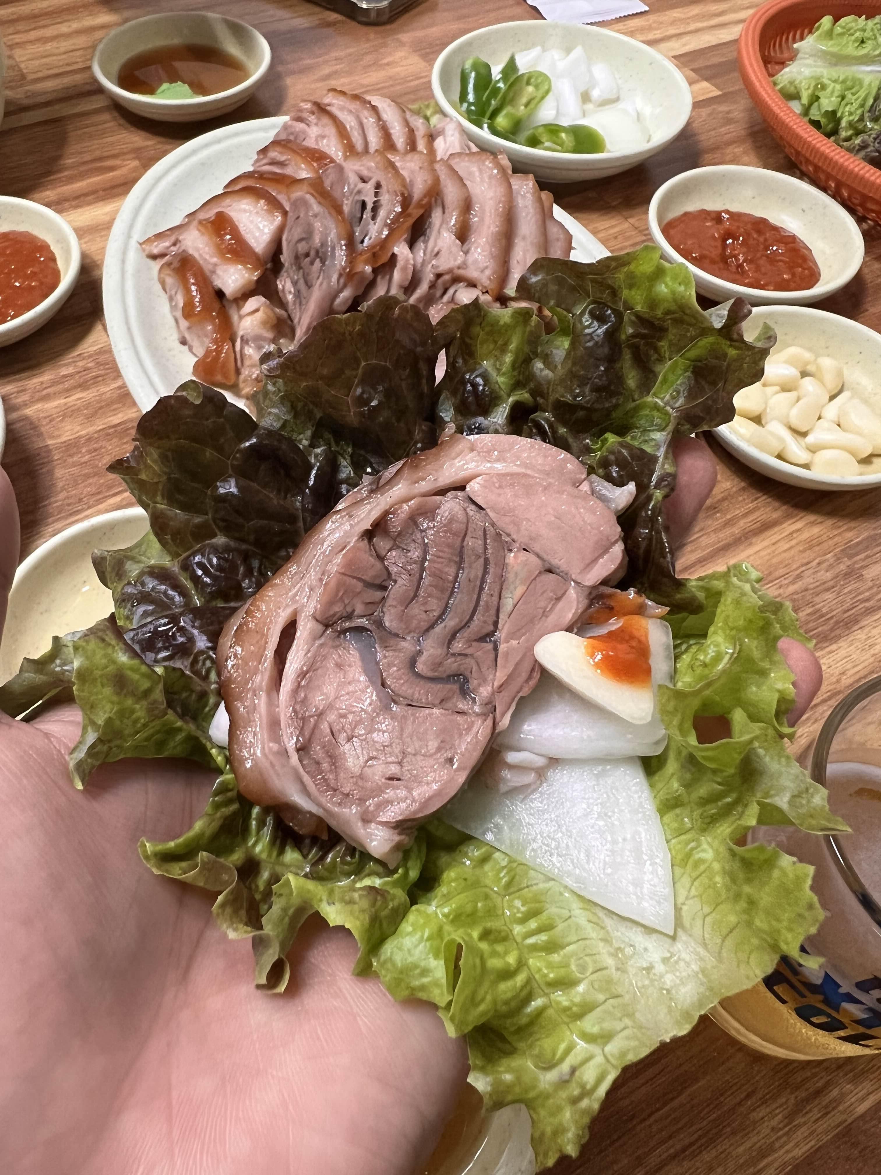 3명이서 먹기에 충분히 많은 양의 족발. 술 한잔에 족발쌈 하나씩 먹다보니 금방 배가 찬다.