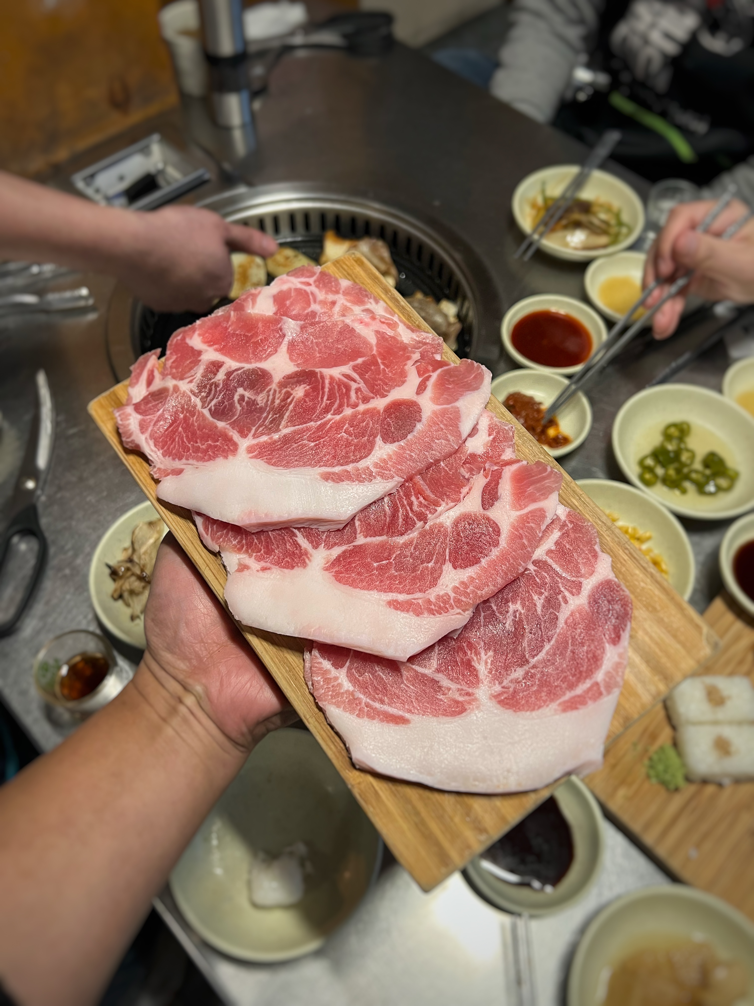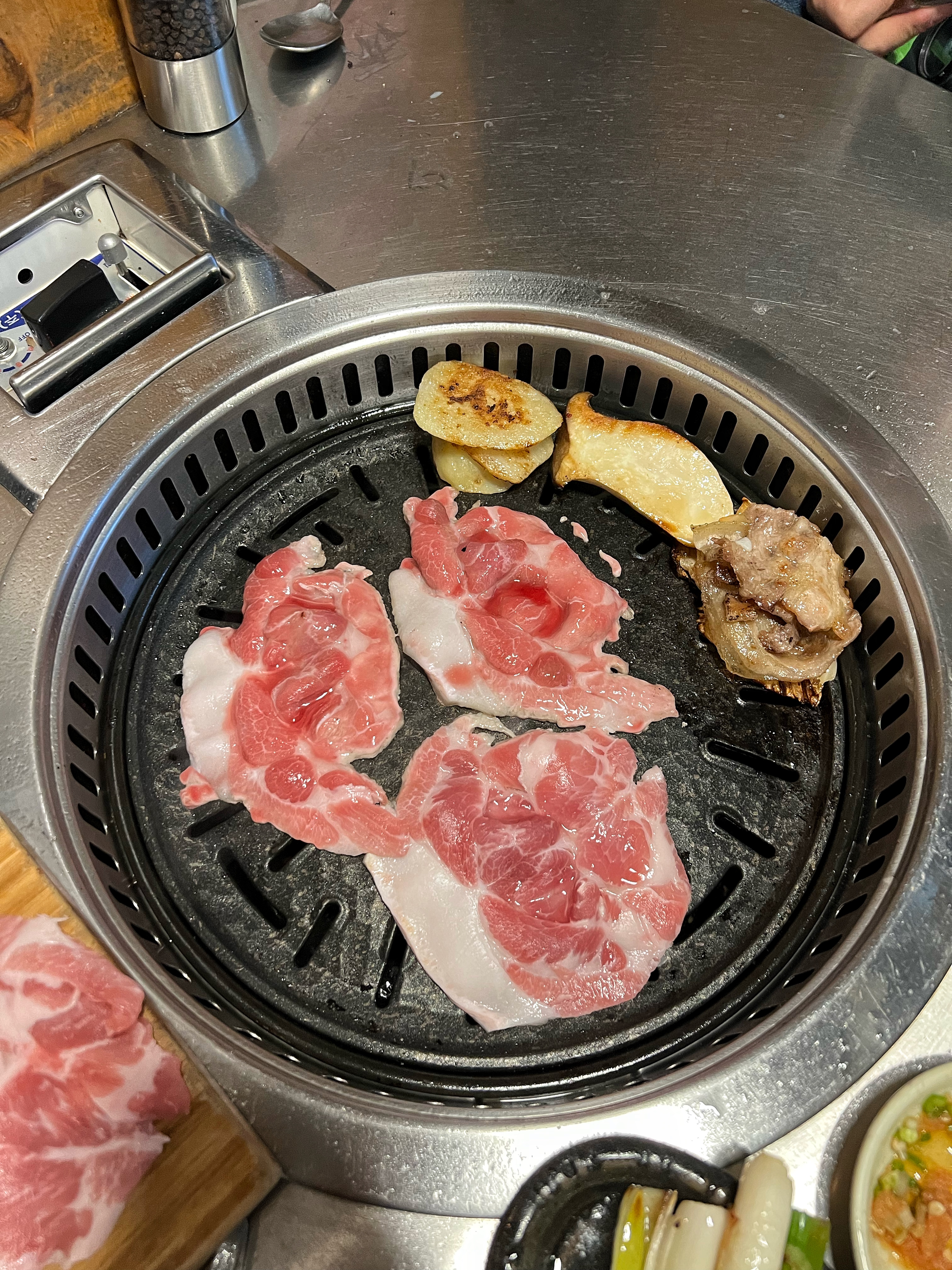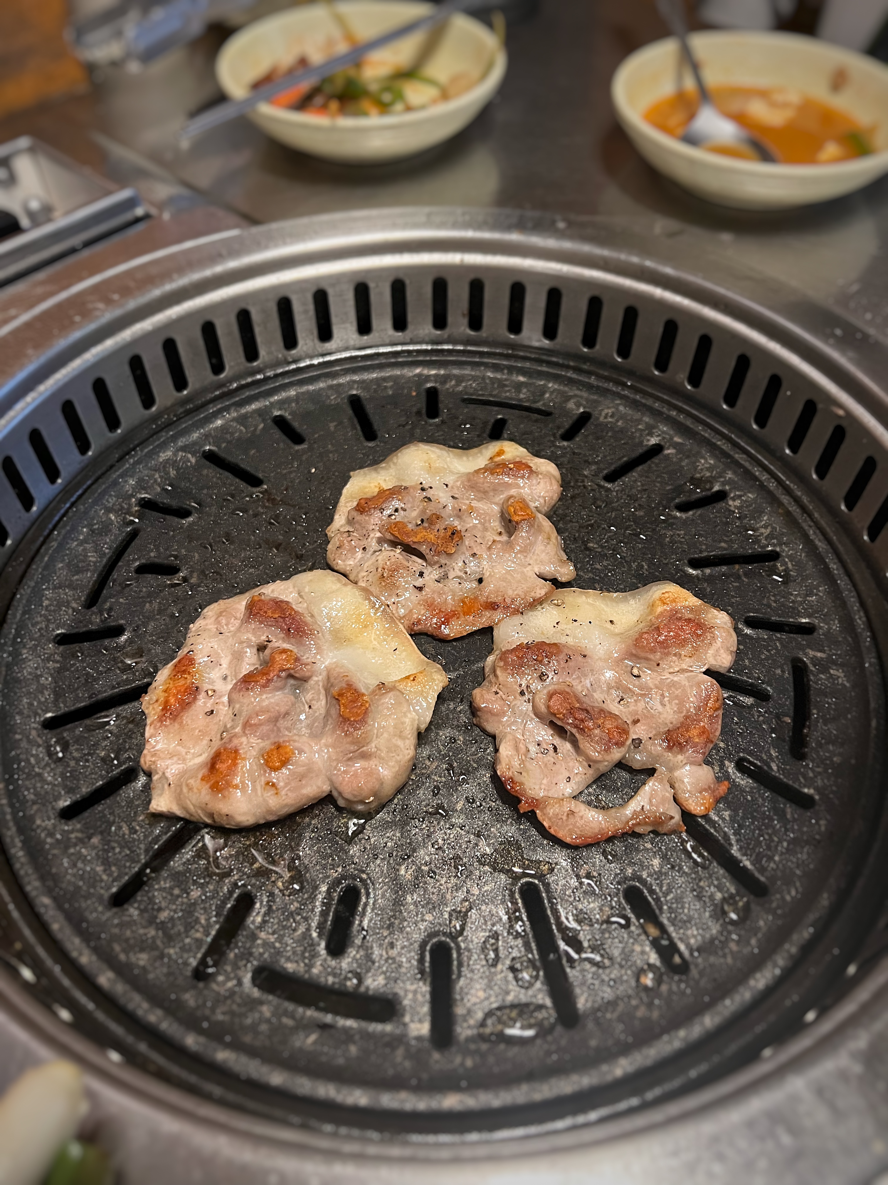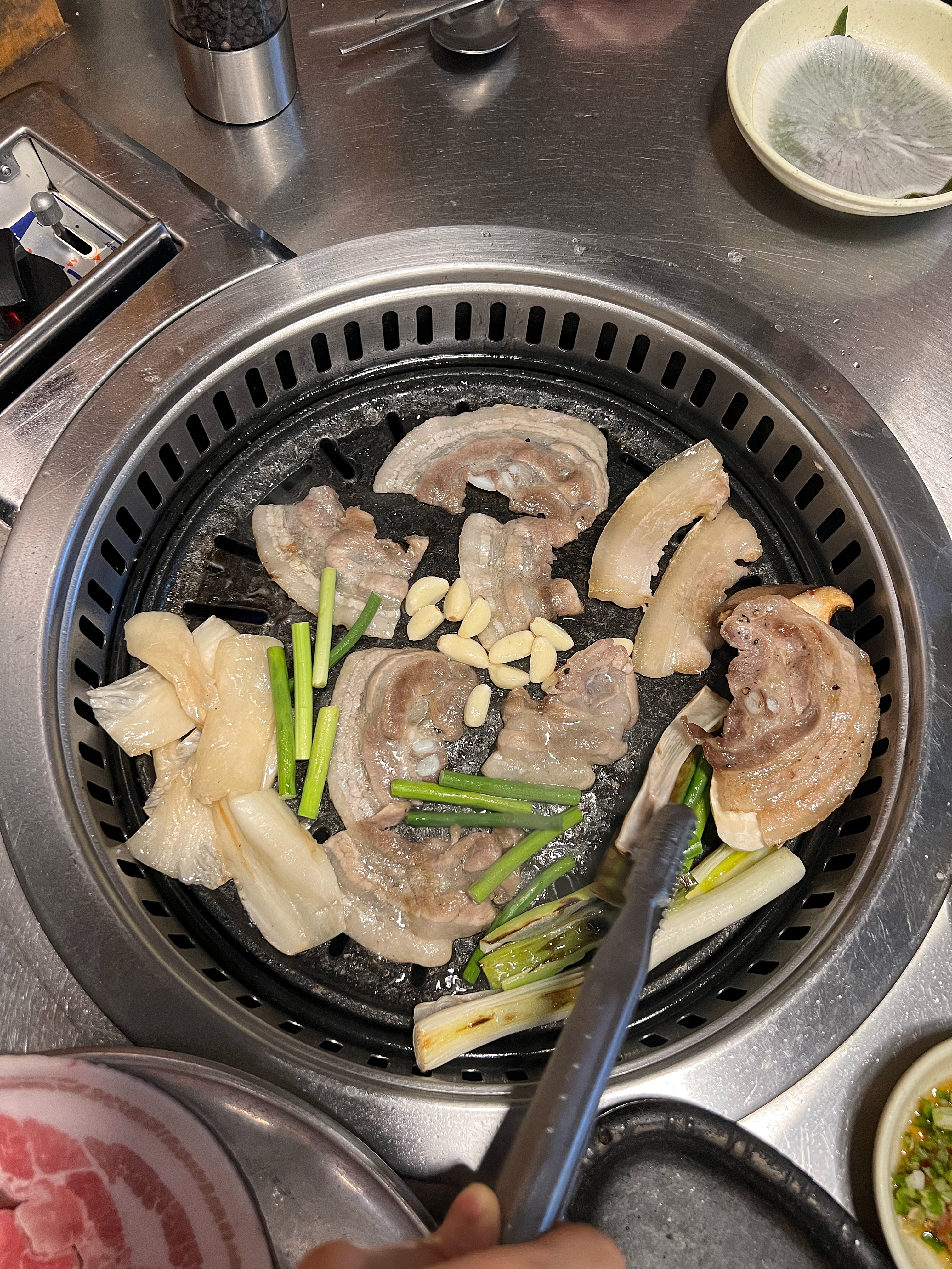 동글동글 말린 삼겹살을 달궈진 불판에 올리고 노릇하게 구워주니 고소한 냄새가 올라온다.