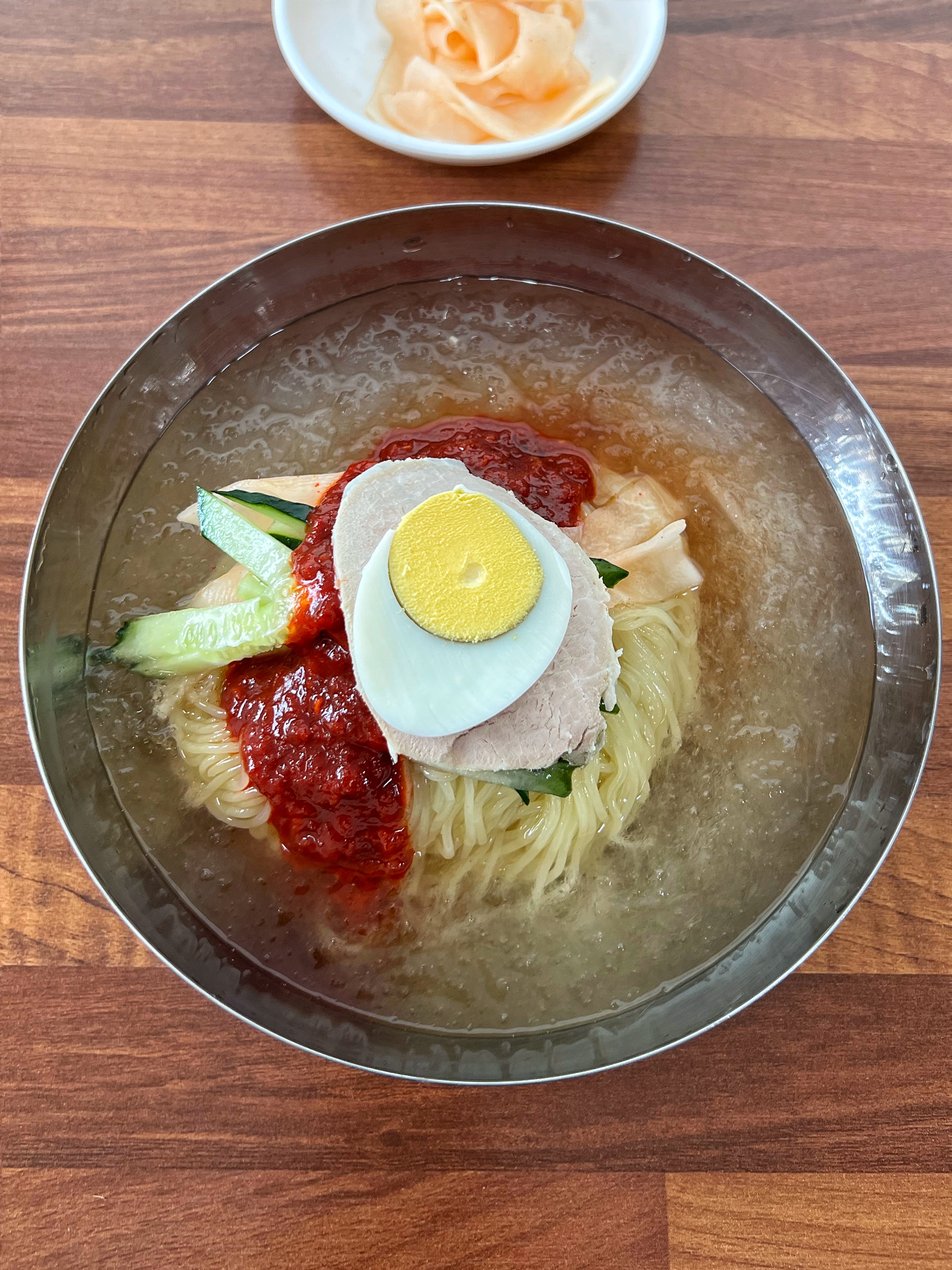 기본 밀면 한 그릇 5,000원. 살얼어 있는 국물이 보기만 해도 시원하다. 면 위에 절임무와 오이를 올리고 양념장을 뿌렸다.