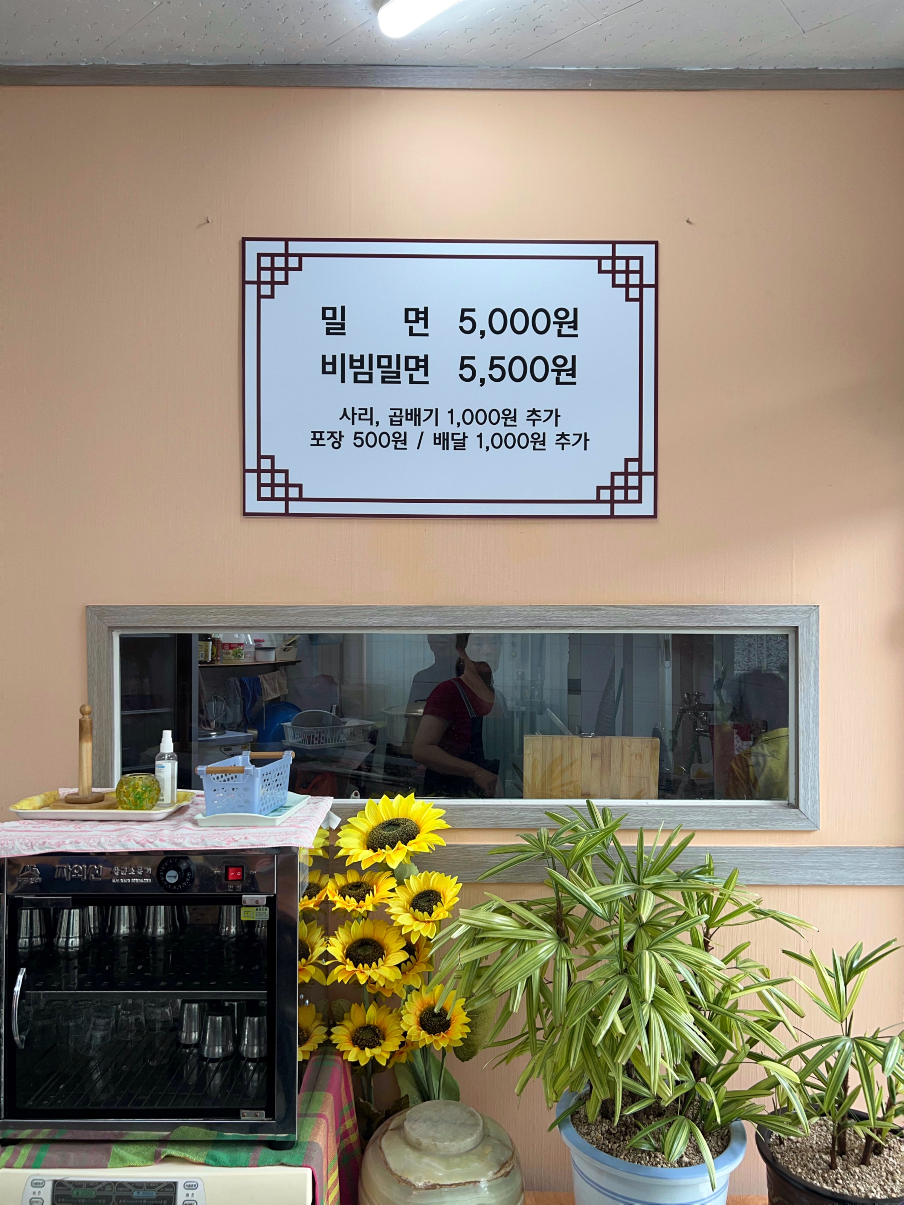 황씨네밀면 메뉴판. 밀면 단일메뉴로 물밀면과 비빔밀면 밖에 없다. 길찾기에 서툴거나 밀면을 먹을 때 사이드로 만두를 꼭 먹어야 한다면 추천하지는 않지만, 가격 참 착하다.